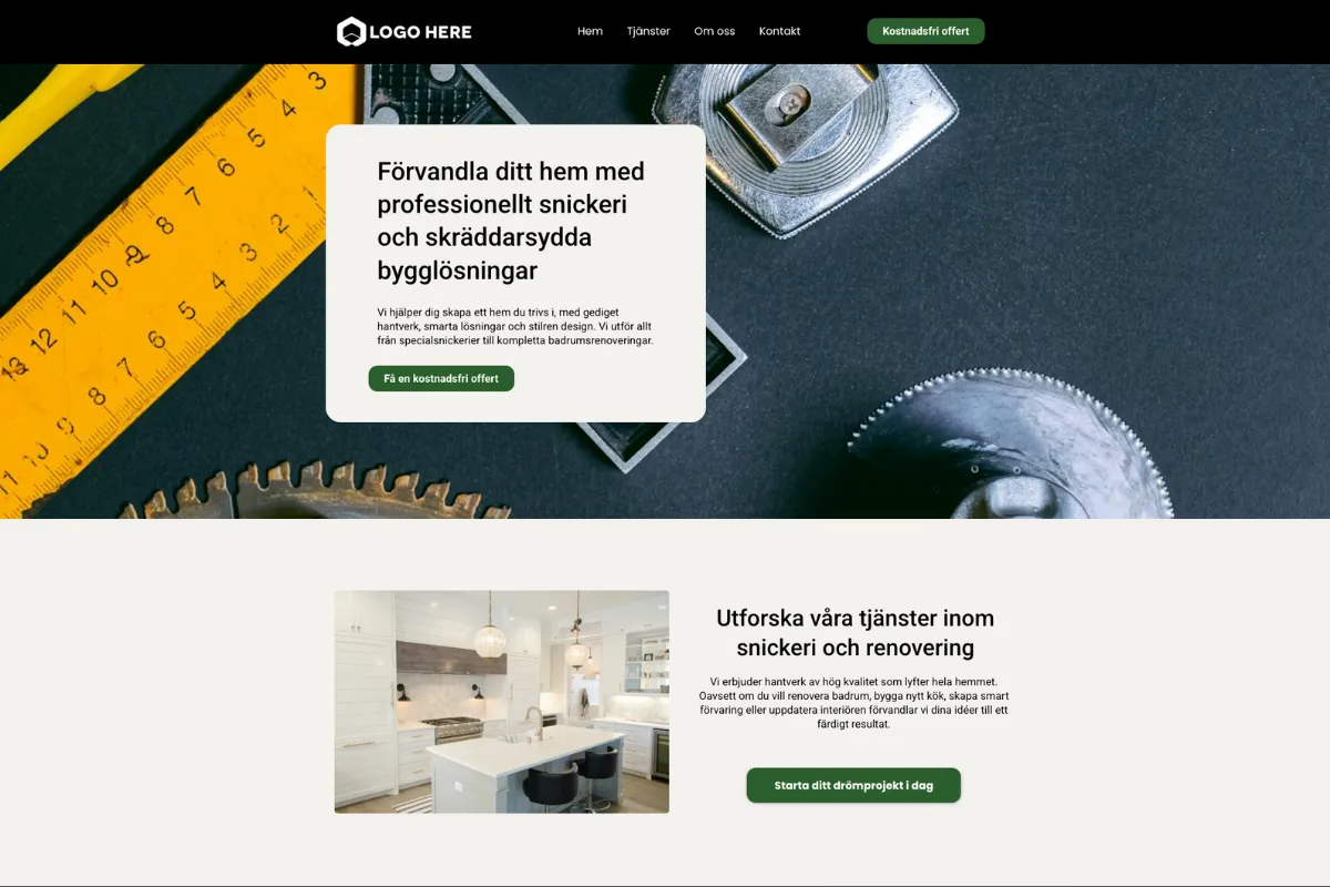 Designen lyfter fram tjänster, referensprojekt och kontaktuppgifter på ett tydligt och pålitligt sätt, perfekt för dig som vill visa upp ditt arbete och få in fler förfrågningar.