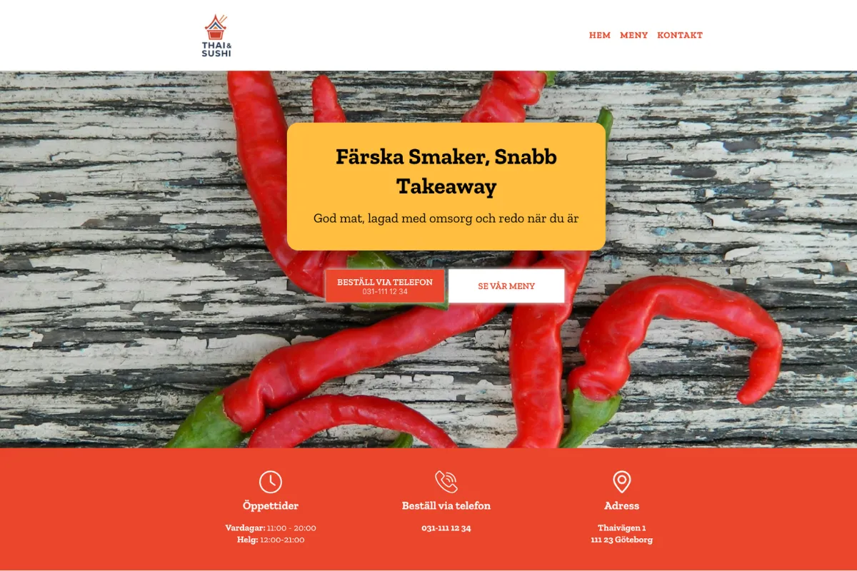 En hemsida som passar perfekt för restauranger med hämtmat, till exempel thailändskt, pizza, indiskt, sushi eller liknande kök.